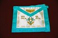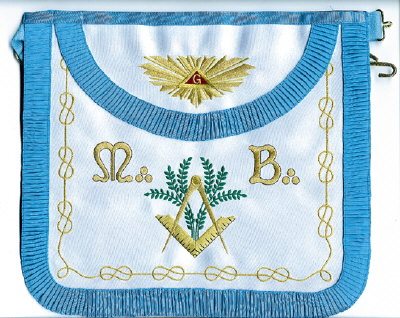 Tablier RF/RFM VM, rectangle, satin, ruban turquoise (ou bleu pâle), bavette brodée Delta & G /Gloire, M:.B:., Eq. Compas, Acacia et lacs d'amour